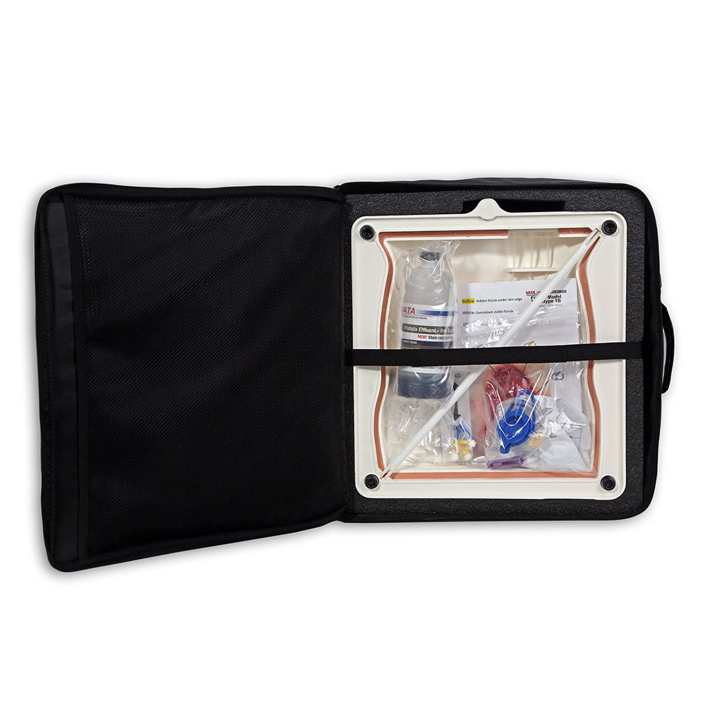 Freddie Fistula™ carrying case is soft-sided design made of a durable fabric and features a built-in supply pouch and includes a handle and shoulder strap for easy carrying.