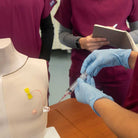 Simulate accessing the following IVAD placements in this medical simulation model: “normal”, “tipping”, “wandering” or deeply placed in the left chest area. Successful access is confirmed by a “blood” return. Fluid can be infused and “blood” withdrawn from all the lines.
