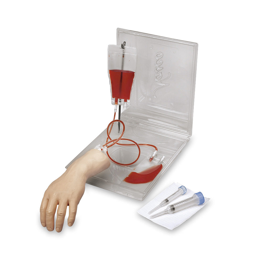 LF00700U, LF00715U and LF00703U The economical Life/form® Portable IV Training Hand combines realism, fine detail, and lightweight convenience in a single trainer. This self-contained trainer is packaged in a plastic case that can be converted into a work station. Trainer includes everything you will need to begin training and practicing IV skills. The Life/form® Portable IV Training Hand Trainer is constructed of soft material with life-like veins in the skin surface that are visible and palpable. Veins are accessible at the back of the hand, making it possible to practice venipuncture at any of the common sites. When puncturing through the vinyl skin and veins, the skin will actually roll as you palpate the veins and the characteristic pop can be felt as the needle penetrates the vein. This trainer is the ideal way to teach venipuncture techniques including starting IVs and introducing Over the Needle IV catheters, and a realistic flashback will be observed when the needle has been accurately inserted into the vein. This trainer is inexpensive enough so that each student can have their own hand to practice technique and skills required in their courses. Under normal use, hundreds of injections may be performed. The skins and veins cannot be changed (trainer will eventually need to be replaced). Included with each trainer is two IV bags, packet of blood powder and spoon, plastic fluid supply stand, two pinch clamps, 3 cc syringe, 12 cc syringe, 12 gauge needle, a winged infusion set, and a plastic clamshell storage case. Five-year warranty.