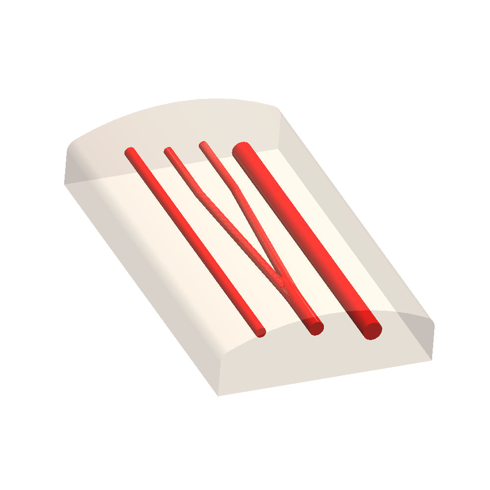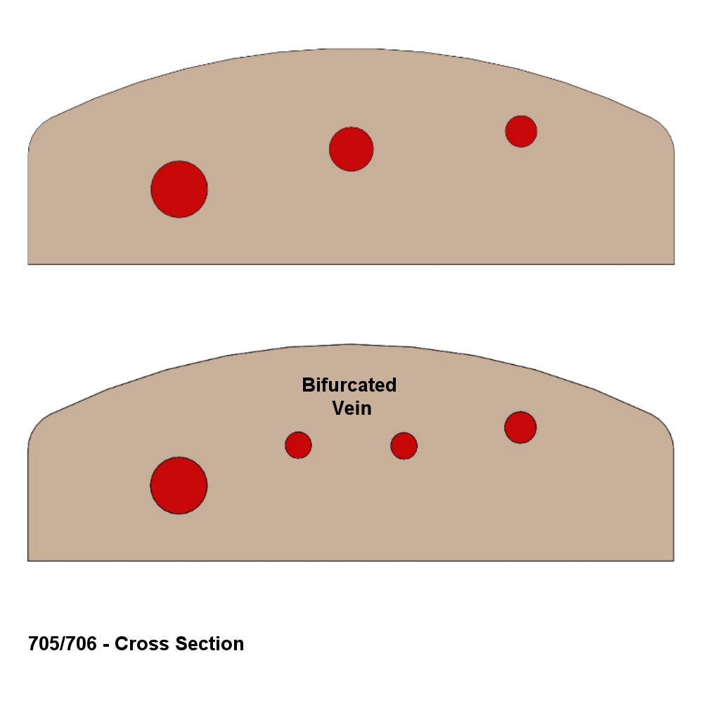 - Mid-sized vein which bifurcates into two smaller vessels (Bifurcated vein 7mm for single larger vein and 5mm for the two bifurcated veins at ~ 12mm depth)
