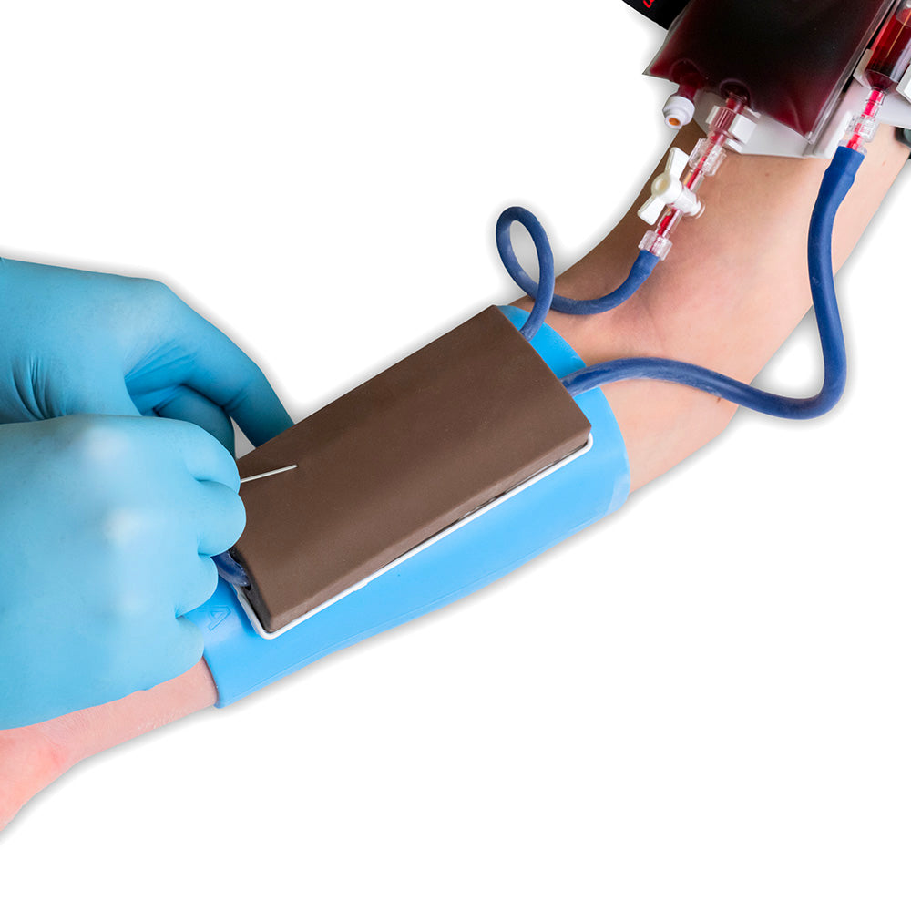 The Wearable Two-Vein IV Access Trainer™ is a versatile and cost-effective IV training model that allows users to refine both their venipuncture technique and patient communication skills. Featuring two veins composed of our proprietary latex-free Dermalike™ material—a medium-sized vein and a deeply placed, larger vein—this trainer delivers an incredibly realistic training experience. A simulated blood “flashback” confirms proper needle placement, helping users build confidence, improve hand-eye coordination, and enhance competency. The rigid backing on the tissue pad prevents accidental needle sticks, ensuring safety for the training partner. Whether worn by a partner for lifelike patient interaction or placed on a manikin for solo practice, this trainer is an ideal alternative to traditional IV training arms, offering high-quality, hands-on learning at a lower cost per use.